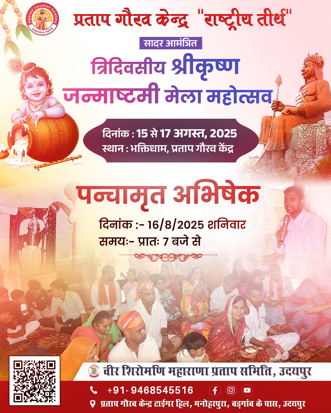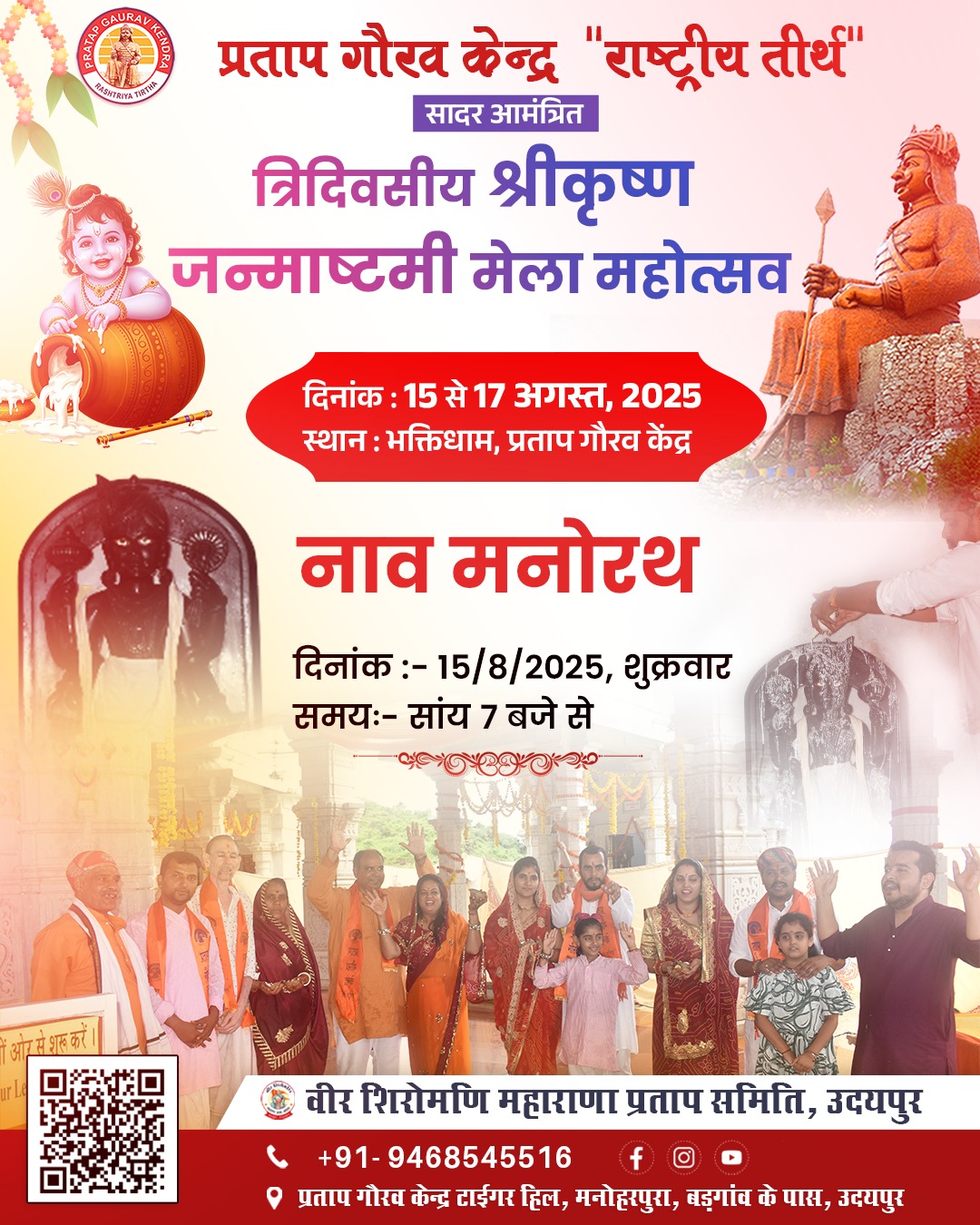प्रताप गौरव केंद्र, राष्ट्रीय तीर्थ उदयपुर हर साल की तरह इस बार भी श्री कृष्ण जन्माष्टमी मेला महोत्सव 2025 का भव्य आयोजन कर रहा है। यह आयोजन 15 अगस्त से 17 अगस्त 2025 तक भक्ति धाम, प्रताप गौरव केंद्र, उदयपुर में होगा।